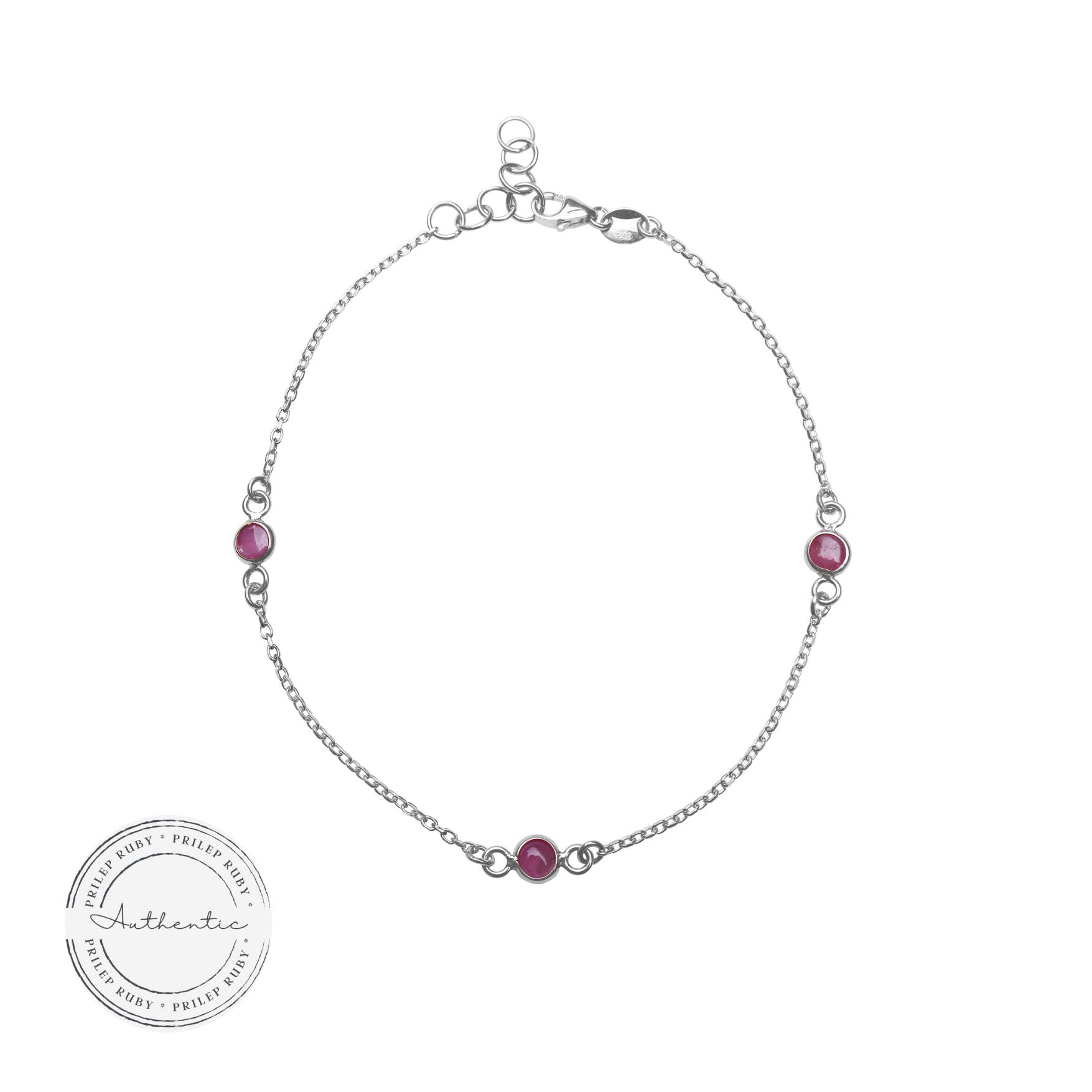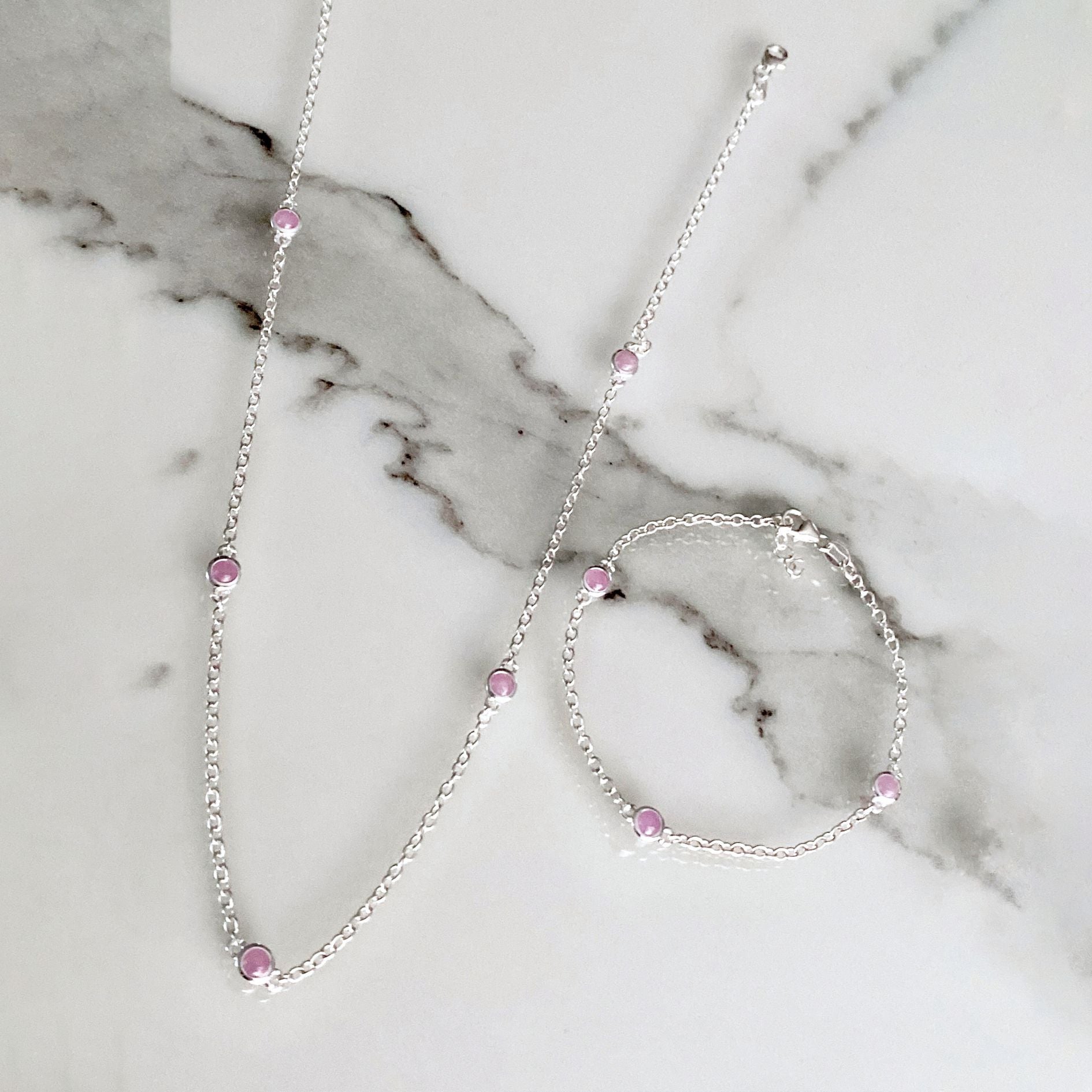 Set in sterling silver, three Prilep Rubies are gently spaced along the chain, creating a quiet rhythm of colour and light. Their soft, unmistakable pink — born of Macedonian earth — captures a rare balance: femininity with strength, beauty with meaning.